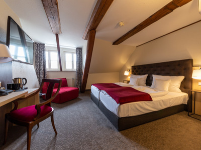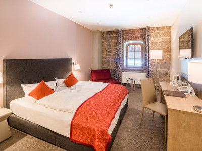 Fra vores historiske gårdterrasse kan du nyde en uforstyrret udsigt over slottet og den kollegiale kirke. Lige overfor kan du opleve havedrømme i Abteigarten og Brühlpark. Eller du kan bare lade dig berøre af den historiske bindingsværksbys flair, som grænser direkte op til hotelejendommen.